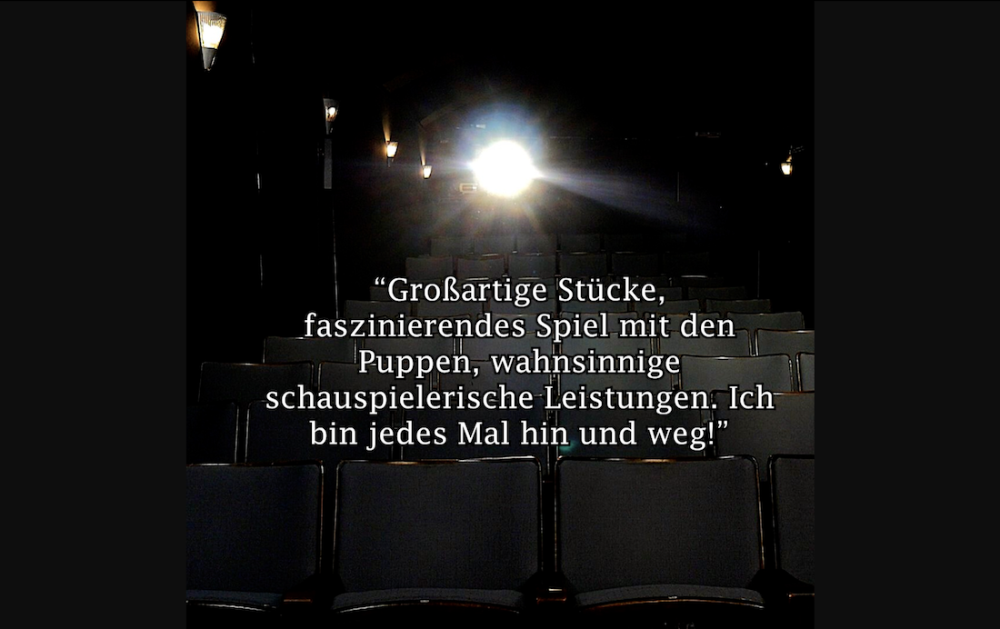Das Repertoire befindet sich im stetigen Wandel, wobei großer Wert darauf gelegt wird, jedem Stück die Zeit für einen angemessenen Reifeprozess zu ermöglichen. So hat auch das Publikum die Möglichkeit, besondere Geschichten und Thematiken mehrfach und aus unterschiedlichen Perspektiven zu erleben. Um kurzlebige Highlights wie die Festivals oder die saisonale Outdoor-Stationentheater-Reihe „Spaziergang für die Figur“ nicht zu verpassen empfehlen wir, sich für aktuelle Neuigkeiten zum Newsletter anzumelden oder uns auf Instagram zu folgen.